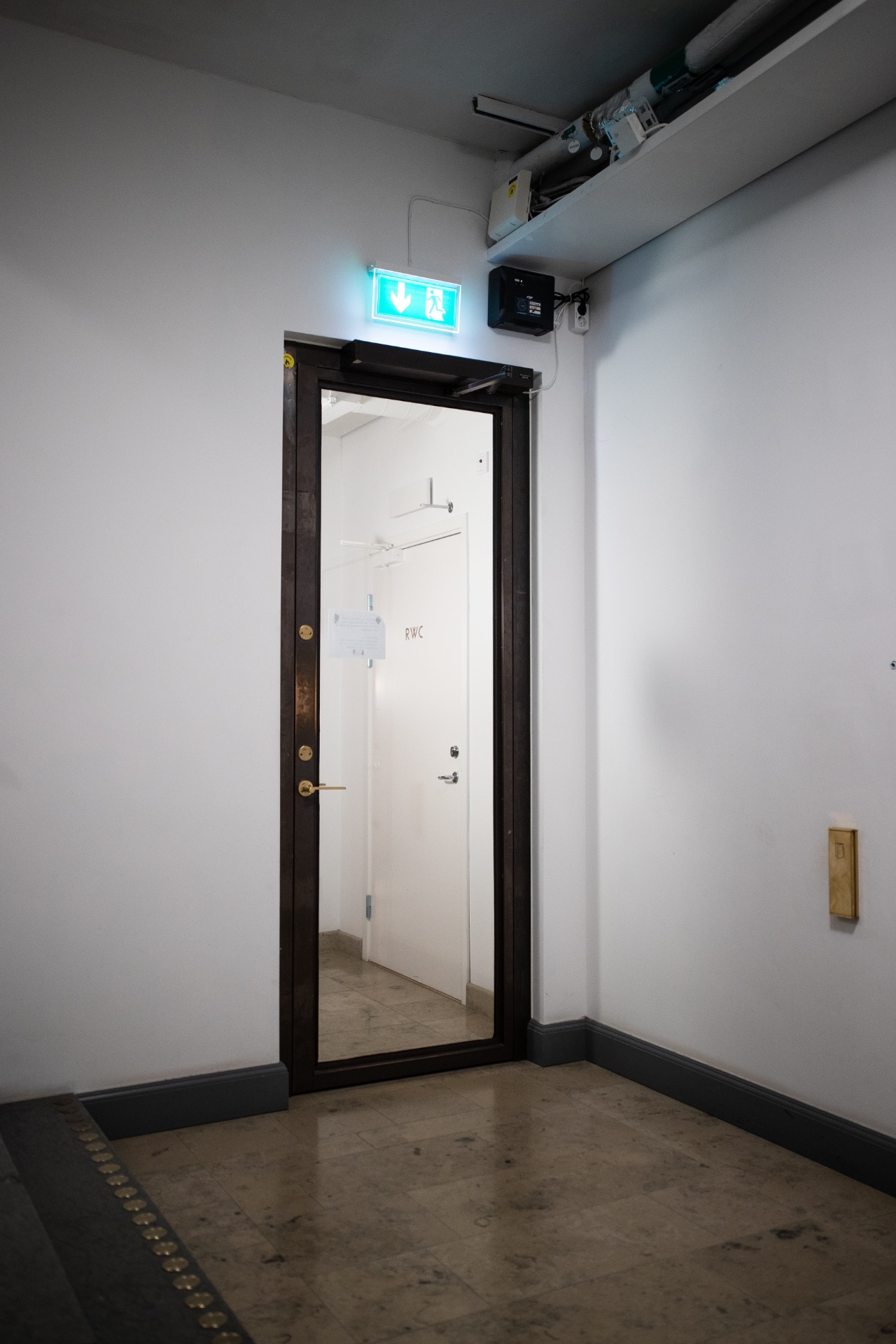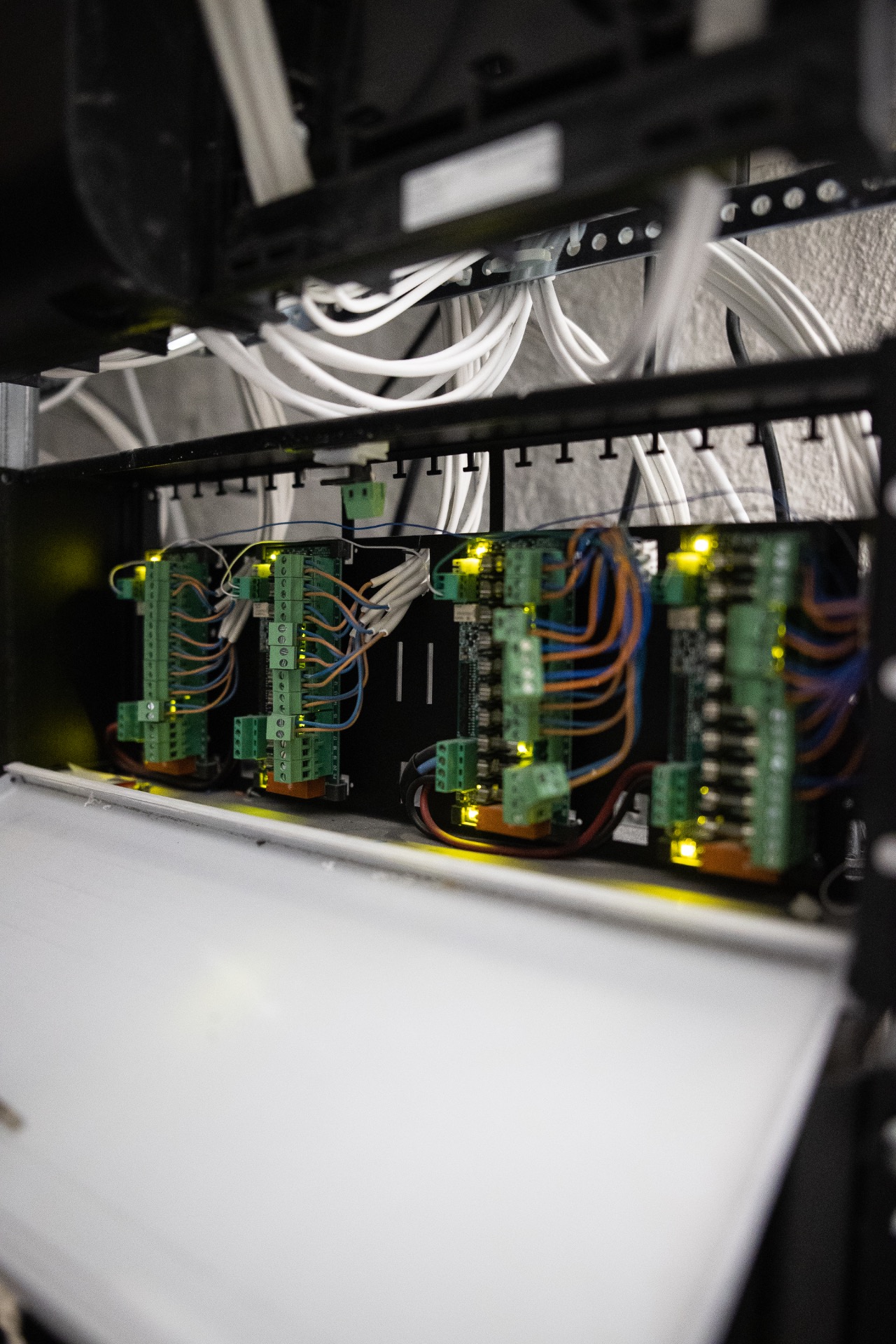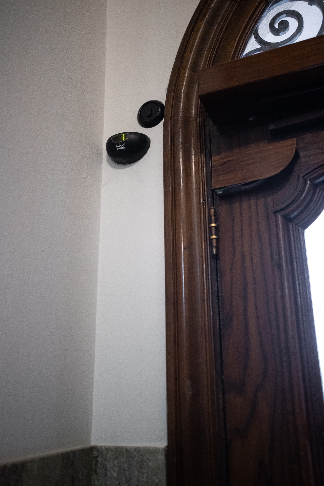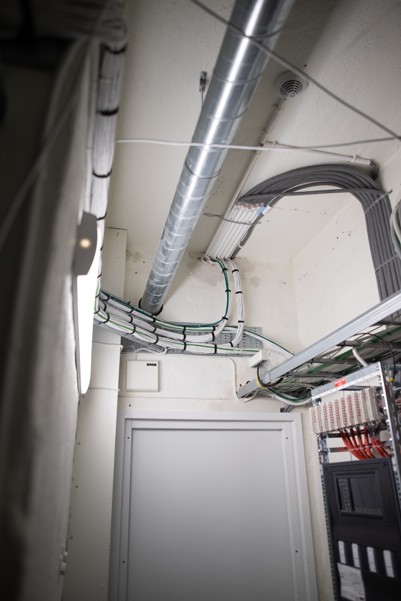 I samband med uppgraderingen bilades nytt kablage in i väggarna för att skapa en ren och diskret installation. Kablage fälldes även in i dörrbladet för att undvika lösa kablar och skydda tekniken mot slitage. De gamla utanpåliggande kopplingsdosorna ersattes med tidstypiska, infällda alternativ som bättre harmonierar med fastighetens originalstil.